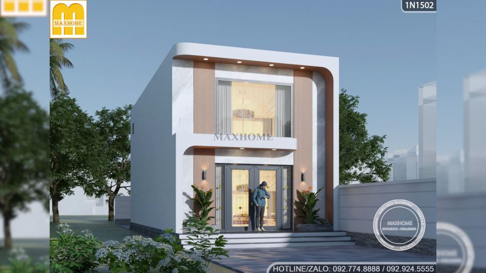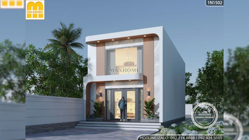 Điểm nổi bật nhất của mẫu nhà 1 tầng 1 lửng này nằm ở mặt tiền rộng 6m. Thay vì sử dụng toàn bộ màu sơn đơn điệu như nhiều công trình khác thì Maxhome đã chọn cách phối hợp vật liệu để tạo chiều sâu. Khu vực trung tâm mặt tiền được ốp nhựa giả gỗ ngoài trời màu nâu chạy từ tầng 1 lên trên vừa sang vừa bền với khí hậu Tây Nguyên. Xung quanh là lớp sơn giả đá trắng vân mây giúp tổng thể mềm mại và thanh thoát hơn. Sự kết hợp giữa nâu và trắng mang lại cảm giác ấm cúng, dễ chịu và phù hợp với phong cách tối giản mà ngôi nhà hướng đến.