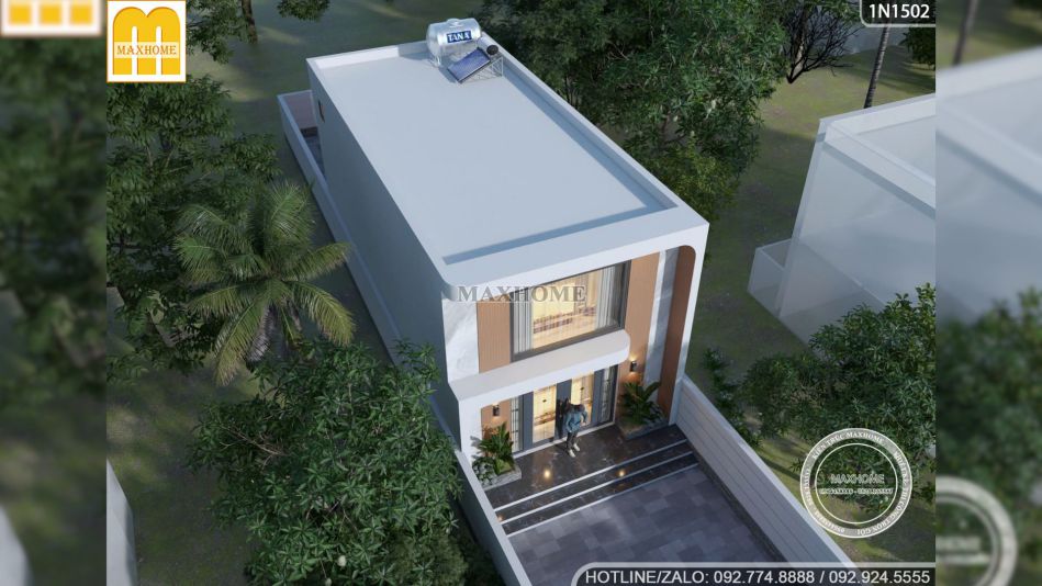 Hệ mái bằng là điểm nhấn không thể bỏ qua trong mẫu nhà 1 tầng 1 lửng này. Mái bằng giúp dáng nhà gọn và sạch sẽ, đúng tinh thần tối giản mà gia đình hướng đến. Khi kết hợp với màu sơn giả đá cùng mảng tường ốp gỗ thì phần mái tạo cảm giác chắc chắn và vững vàng. Bên cạnh tính thẩm mỹ, mái bằng còn mang nhiều lợi ích như dễ bảo dưỡng, chống nóng tốt khi xử lý đúng kỹ thuật và có thể tận dụng để đặt bồn nước hoặc hệ thống năng lượng mặt trời.