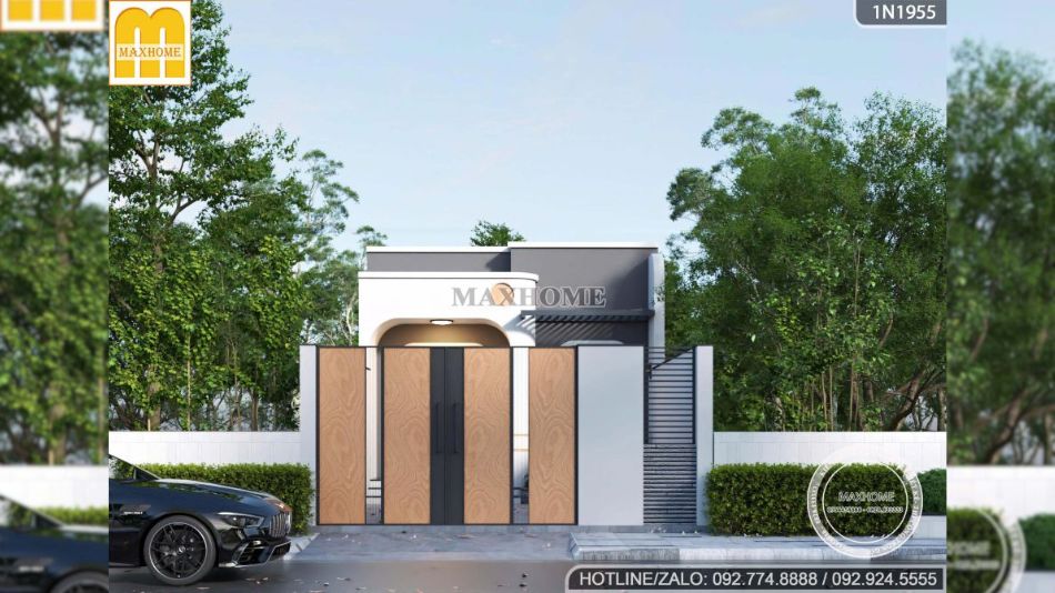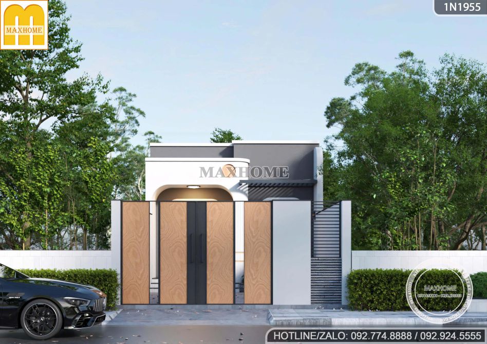 Mẫu nhà một tầng mái bằng trở nên nổi bật ngay từ cái nhìn đầu tiên nhờ hệ cổng được thiết kế theo phong cách tối giản nhưng tinh tế. Điểm nhấn nằm ở sự kết hợp giữa hệ cửa sắt sơn tĩnh điện màu gỗ ấm áp và tường bao bê tông kiên cố. Sự đan xen này không chỉ đảm bảo tính bảo mật, riêng tư mà còn tạo nên một diện mạo hiện đại, trẻ trung, rất phù hợp với xu hướng kiến trúc tối giản hiện nay.