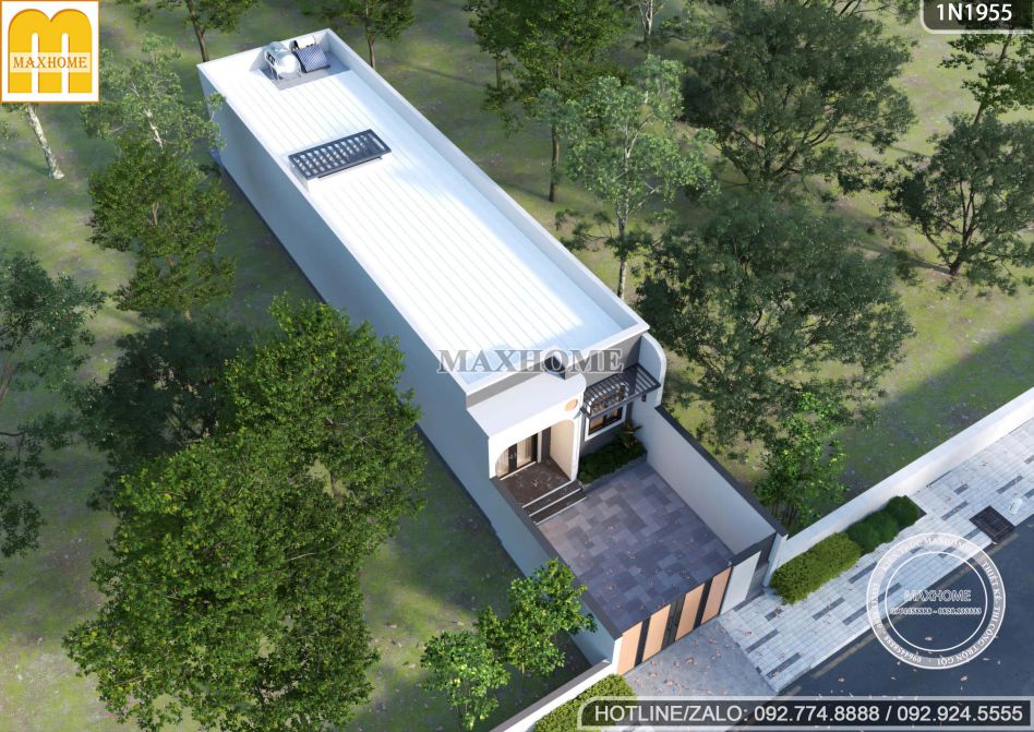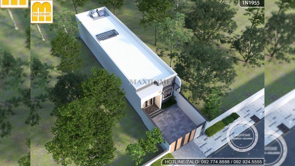 Từ góc nhìn trên cao có thể thấy ngôi nhà 1 tầng được thiết kế mái bằng gọn gàng, hiện đại, kết hợp sử dụng tôn chống nóng giúp hạn chế hấp thụ nhiệt, giữ cho không gian bên trong luôn mát mẻ và dễ chịu. Bên cạnh đó, hệ thống giếng trời được bố trí hợp lý, góp phần tăng cường khả năng lấy sáng và thông gió tự nhiên, giúp ngôi nhà luôn thông thoáng, tiết kiệm năng lượng và nâng cao chất lượng sinh hoạt hàng ngày.