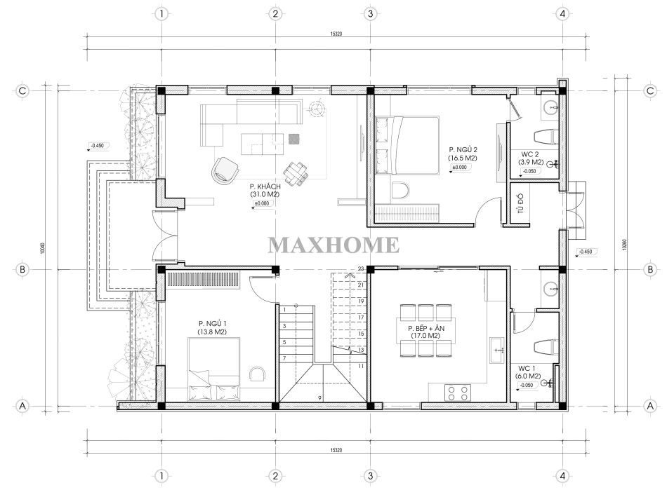 Ngôi nhà 2 tầng 1 tum mái bằng không chỉ sở hữu vẻ đẹp sang trọng, tinh tế mà còn được thiết kế tối ưu công năng, hài hòa các yếu tố phong thủy để thu hút sinh khí và tài lộc cho gia chủ. Tọa lạc tại hướng Tây Bắc, công trình có diện tích xây dựng 10 x 15,3m và tổng diện tích sử dụng khoảng 250m². KTS đã bố trí không gian sinh hoạt một cách khoa học, đảm bảo sự tiện nghi, riêng tư mà vẫn gắn kết, tạo nên tổ ấm ấm cúng và thoải mái.