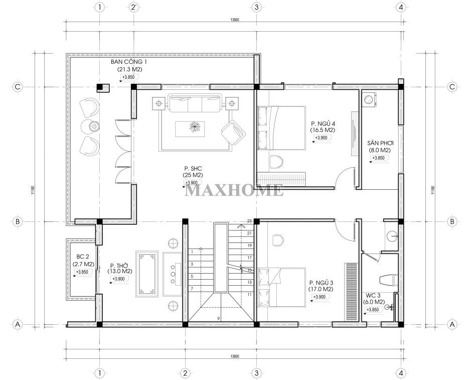 Tầng 2 được thiết kế với bố cục khoa học, gồm hai phòng ngủ rộng rãi, thông thoáng, mang đến không gian nghỉ ngơi riêng tư và tiện nghi cho các thành viên trong gia đình. Khu vực phòng thờ được đặt ở vị trí trang trọng, hướng ra ban công, vừa đón nhận ánh sáng tự nhiên, vừa đảm bảo các yếu tố phong thủy hài hòa.