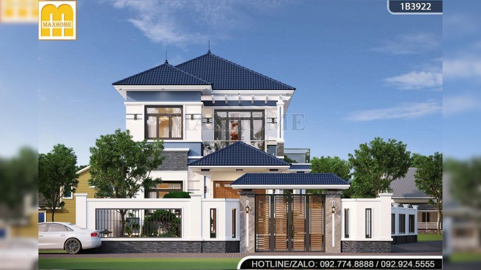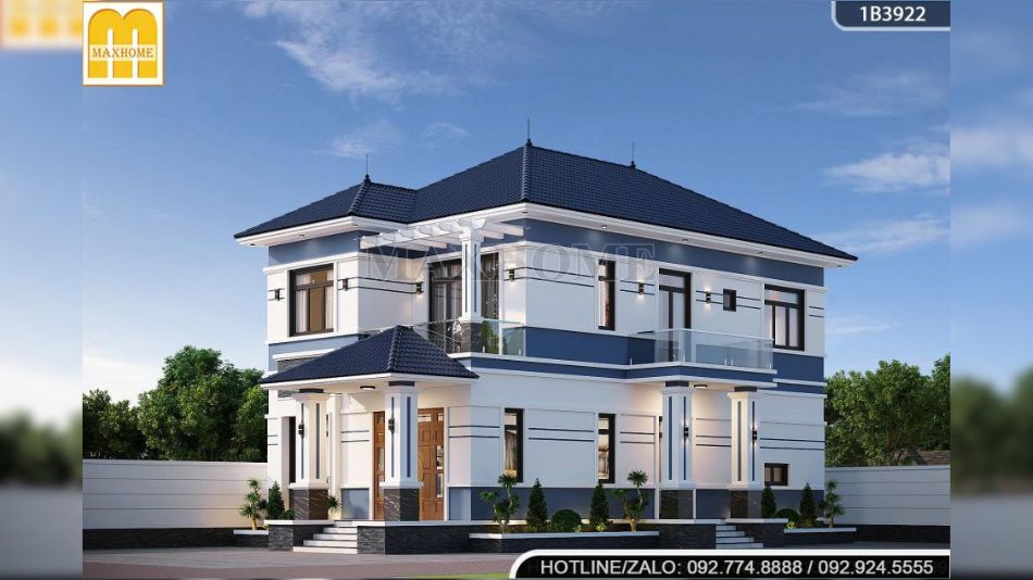 Ngôi nhà sử dụng gam màu chủ đạo trắng – xanh, trong đó màu trắng được coi là tông màu kinh điển, giúp tôn lên vẻ đẹp của các đường nét kiến trúc và chi tiết trang trí, còn màu xanh mang đến cảm giác nhẹ nhàng, thanh lịch và cân bằng thị giác.