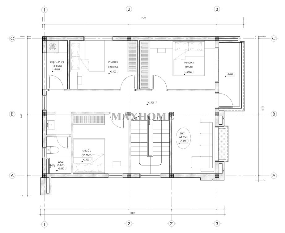Tầng 2 được bố trí hợp lý với phòng sinh hoạt chung thiết kế mở, liên kết trực tiếp với sảnh tầng tạo cảm giác thoáng và dễ kết nối giữa các thành viên. Ba phòng ngủ đều có diện tích rộng rãi, thông gió tốt và được bố trí nội thất gọn gàng để đảm bảo sự thoải mái trong nghỉ ngơi. Khu vệ sinh chung và không gian giặt phơi được đặt cuối nhà để giữ sự riêng tư, hạn chế ẩm và giúp lưu thông trong nhà luôn sạch và thoáng.