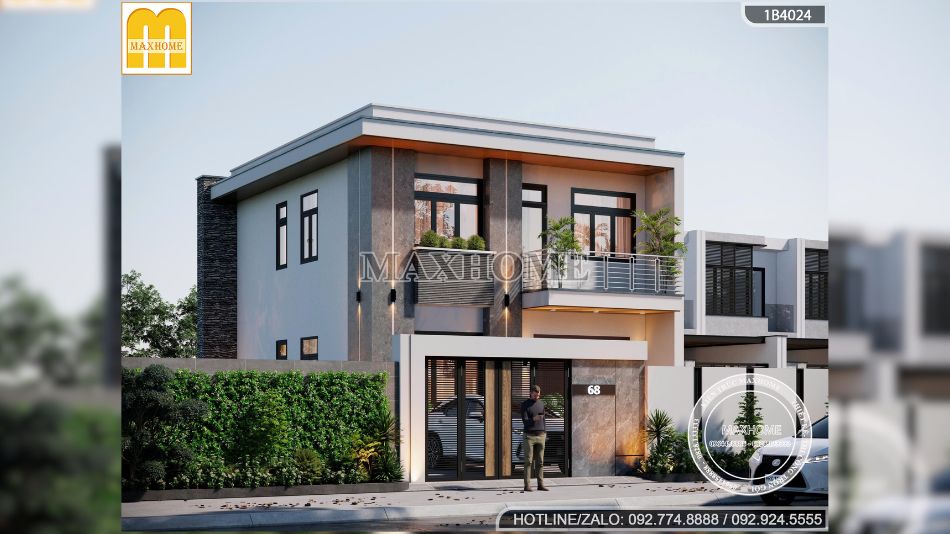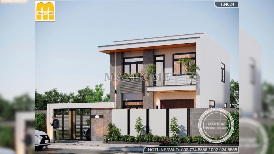 Từ góc nhìn chính diện, ngôi nhà 2 tầng 4 phòng ngủ mái bằng gây ấn tượng mạnh bởi hình khối vuông vắn, đường nét sắc gọn và bố cục hiện đại đúng chuẩn kiến trúc thời thượng.