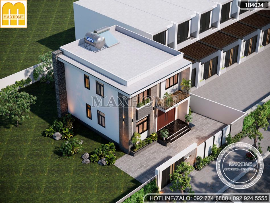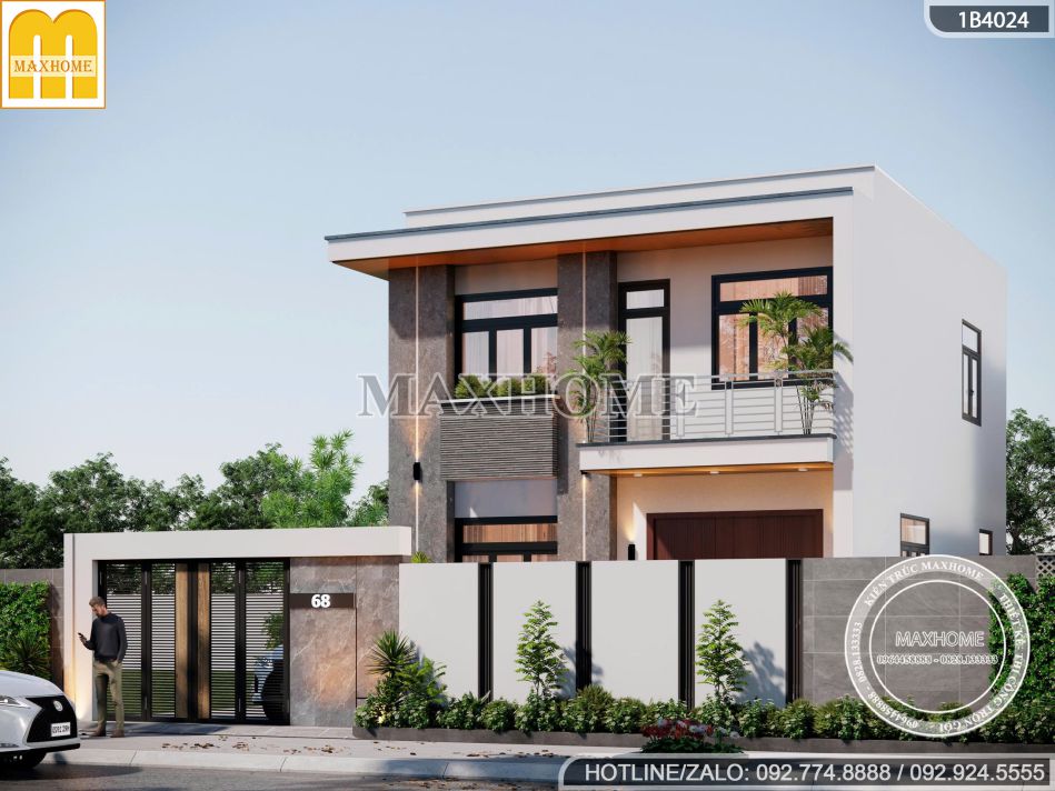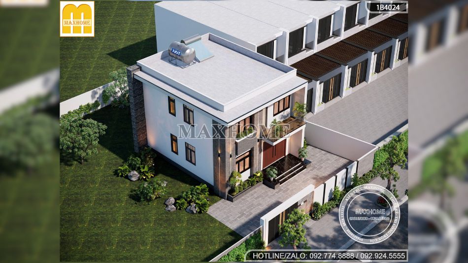 Mẫu nhà mái bằng 2 tầng 4 phòng ngủ hiện đại được kiến tạo từ những khối hình học vuông vắn, kết hợp linh hoạt giữa các mảng kiến trúc có kích thước đa dạng, tạo nên vẻ đẹp độc đáo và thu hút. Sự sắp đặt sáng tạo này không chỉ mang lại diện mạo ấn tượng mà còn mở ra những khoảng không gian rộng rãi, giúp tối ưu ánh sáng và thông gió tự nhiên. Nhờ đó, ngôi nhà không chỉ thể hiện sự sang trọng, hiện đại mà còn mang đến cảm giác thư thái như được hoà mình với thiên nhiên xanh mát.