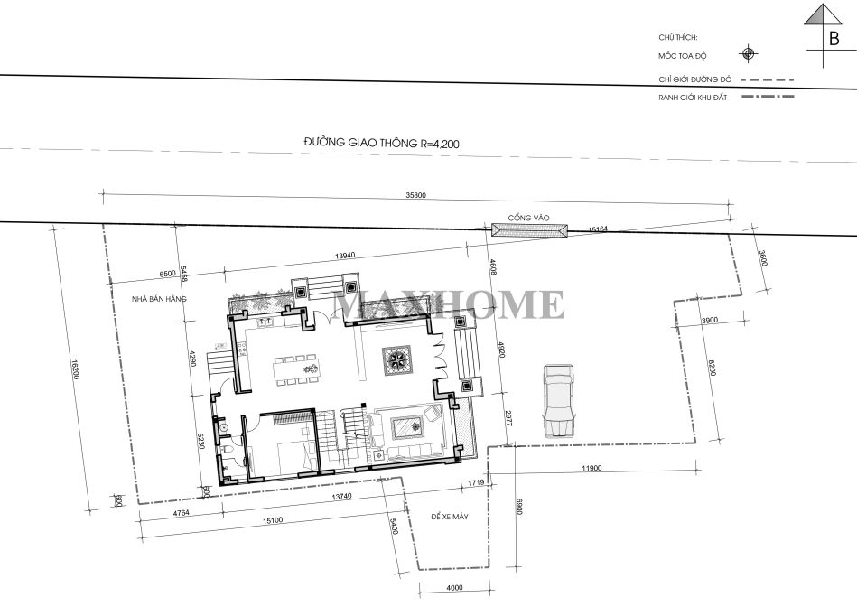 Theo hoa tiêu chữ B trên bản vẽ định vị, ngôi nhà mái Nhật 2 tầng được bố trí theo hướng Đông Bắc – hướng mang lại sinh khí tốt, đón nắng sớm và gió lành, giúp không gian luôn thoáng mát và tràn đầy năng lượng.