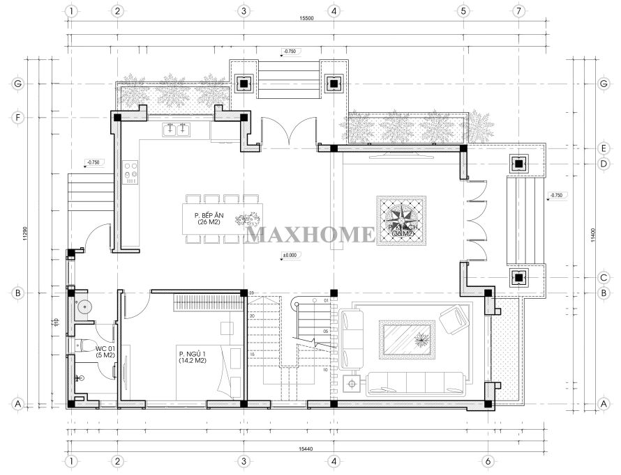 Từ đây, các thành viên có thể tận hưởng không khí trong lành, ngắm cảnh quan xung quanh và cảm nhận sự kết nối hài hòa giữa ngôi nhà và thiên nhiên. Đây cũng là không gian sinh hoạt ngoài trời lý tưởng để thư giãn, đọc sách, thưởng trà hay cùng gia đình trò chuyện, tận hưởng những phút giây bình yên sau một ngày làm việc bận rộn.