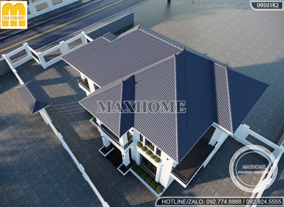 Điểm nhấn nổi bật nhất trong thiết kế chính là hệ mái Nhật xanh ghi thanh lịch. Dáng mái đổ rộng với độ dốc vừa phải không chỉ mang đến nét duyên dáng mềm mại mà còn tối ưu khả năng thoát nước, chống thấm, chống nóng hiệu quả, phù hợp hoàn hảo với điều kiện khí hậu miền Bắc.