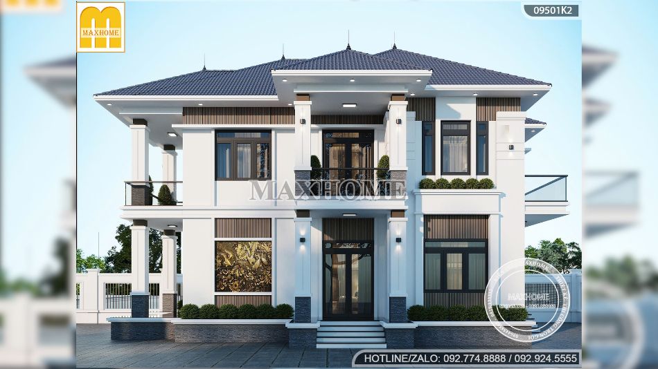 Điểm nhấn nổi bật nhất trong thiết kế chính là hệ mái Nhật xanh ghi thanh lịch. Dáng mái đổ rộng với độ dốc vừa phải không chỉ mang đến nét duyên dáng mềm mại mà còn tối ưu khả năng thoát nước, chống thấm, chống nóng hiệu quả, phù hợp hoàn hảo với điều kiện khí hậu miền Bắc.