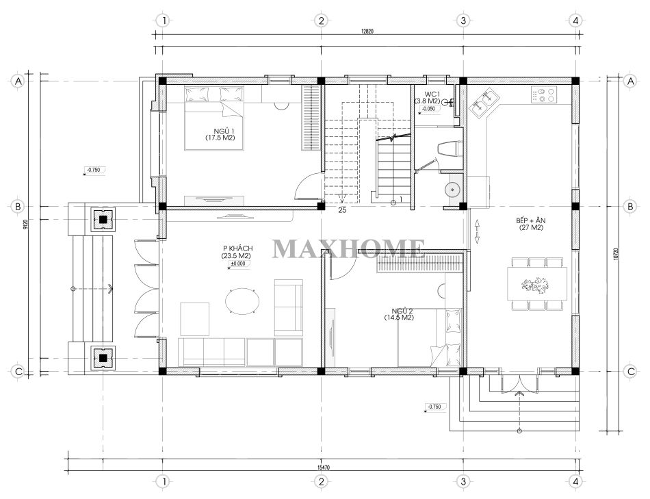 Không gian tầng 1 được tổ chức hợp lý, trong đó phòng khách rộng 23,5m² đóng vai trò trung tâm, vừa sang trọng để đón tiếp khách, vừa là nơi cả gia đình sum họp, sinh hoạt chung. Hai phòng ngủ được bố trí tách biệt nhằm đảm bảo sự riêng tư, với một phòng đặt liền kề cầu thang giúp thuận tiện di chuyển, phòng còn lại nằm gọn gàng trong tổng thể mặt bằng.