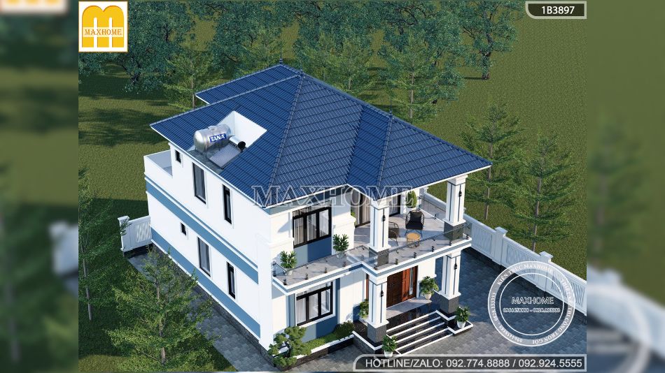 Hệ mái Nhật được thiết kế cân đối, chắc chắn, mái màu xanh hài hòa trên nền sơn trắng, trong khi cửa gỗ nâu trầm tạo điểm nhấn ấm áp, sang trọng cho tổng thể kiến trúc. Khi kết hợp cùng mảng xanh sân vườn xung quanh, công trình toát lên vẻ đẹp hài hòa, tinh tế và đáp ứng trọn vẹn tiêu chí của một không gian sống hiện đại, lý tưởng cho gia đình.
