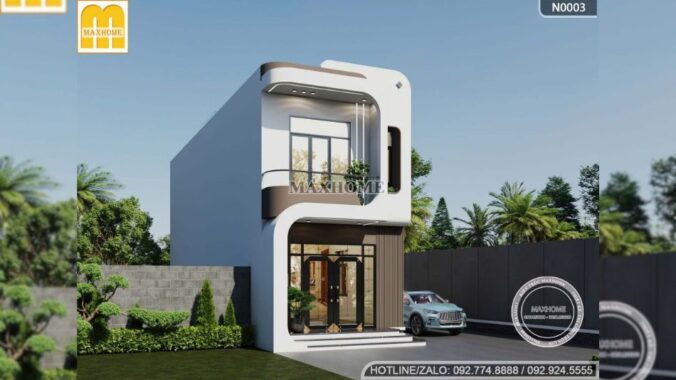 Màu trắng là tone màu chủ đạo có vai trò làm nổi bật các chi tiết trang trí kết hợp cùng màu xanh dương thanh lịch khiến công trình thêm trang nhã, nổi bật và thu hút hơn. 1 phần diện tường tầng 1 được ốp đá chẻ làm tăng vẻ đẹp sang trọng cũng như chống bám bẩn sau một thời gian sử dụng. Tầng 2 sử dụng những đường kẻ chỉ lõm tăng tạo sự tinh tế và chiều sâu cho mặt đứng của ngôi nhà, đồng thời làm nổi bật vẻ đẹp hiện đại mà không cần quá cầu kỳ.