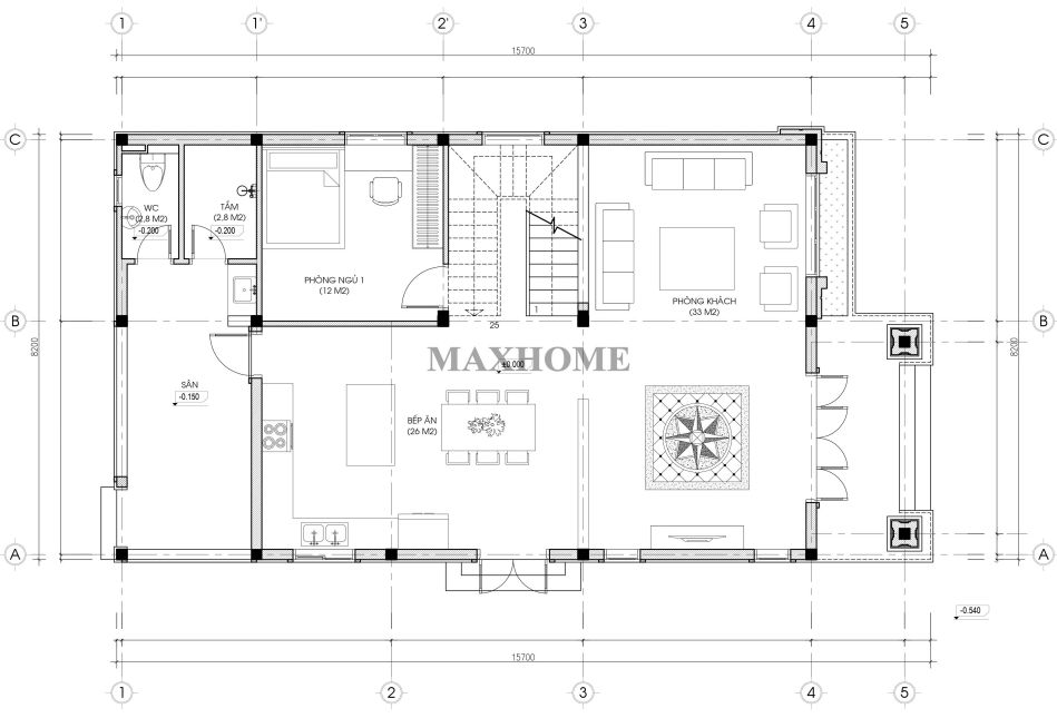 Dựa vào bản vẽ mặt bằng định vị, có thể thấy khuôn viên đất dành cho ngôi nhà 2 tầng có kích thước 8,2 x 15,7m. Với quy mô này, tổng diện tích sử dụng của công trình đạt khoảng 238m², đủ để bố trí đầy đủ các không gian chức năng như phòng khách, phòng bếp – ăn, các phòng ngủ và khu vực sinh hoạt chung, đảm bảo sự tiện nghi và thoải mái cho gia đình.