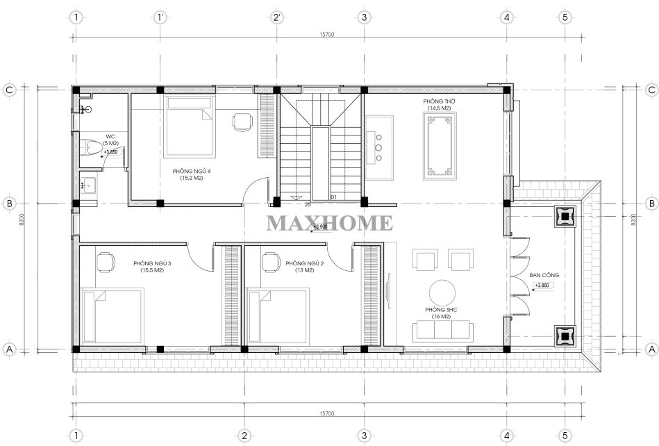• Tầng 2: Phòng thờ, phòng sinh hoạt chung, 3 phòng ngủ, 1 wc