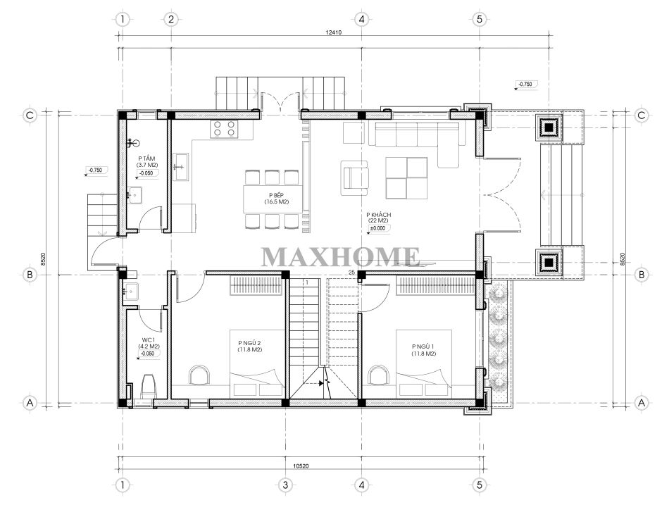 Công trình có kích thước xây dựng 8,5 x 12,4m, tổng diện tích sử dụng khoảng 195m², được quy hoạch công năng hợp lý giữa các khu vực chung và riêng, tạo sự liên kết chặt chẽ mà vẫn đảm bảo tính riêng tư.