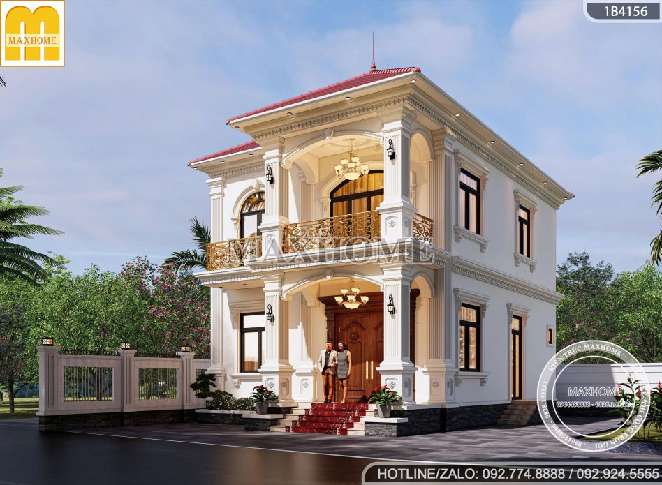 Mẫu nhà 2 tầng mái Nhật tân cổ điển gây ấn tượng mạnh ngay từ cái nhìn đầu tiên bởi vẻ đẹp bề thế, sang trọng nhưng vẫn rất hài hòa với cảnh quan xung quanh. Công trình là sự kết hợp tinh tế giữa tinh thần kiến trúc tân cổ điển châu Âu và phong cách mái Nhật hiện đại, tạo nên một tổng thể cân đối, thanh lịch và trường tồn theo thời gian. Điểm nhấn nổi bật nhất chính là hệ mái ngói đỏ sang trọng, nổi bật trên nền tường trắng tinh khôi, mang lại cảm giác ấm áp, vững chãi và đầy cuốn hút.