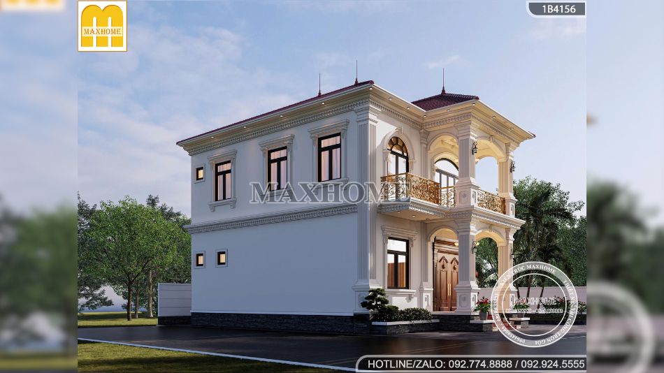 Màu sắc ngoại thất của ngôi nhà được lựa chọn theo bảng màu kinh điển của kiến trúc tân cổ điển. Tông trắng chủ đạo mang đến vẻ đẹp tinh khôi, thanh lịch và làm nền hoàn hảo để tôn lên các chi tiết trang trí như phào chỉ, cột trụ, lan can mạ vàng.