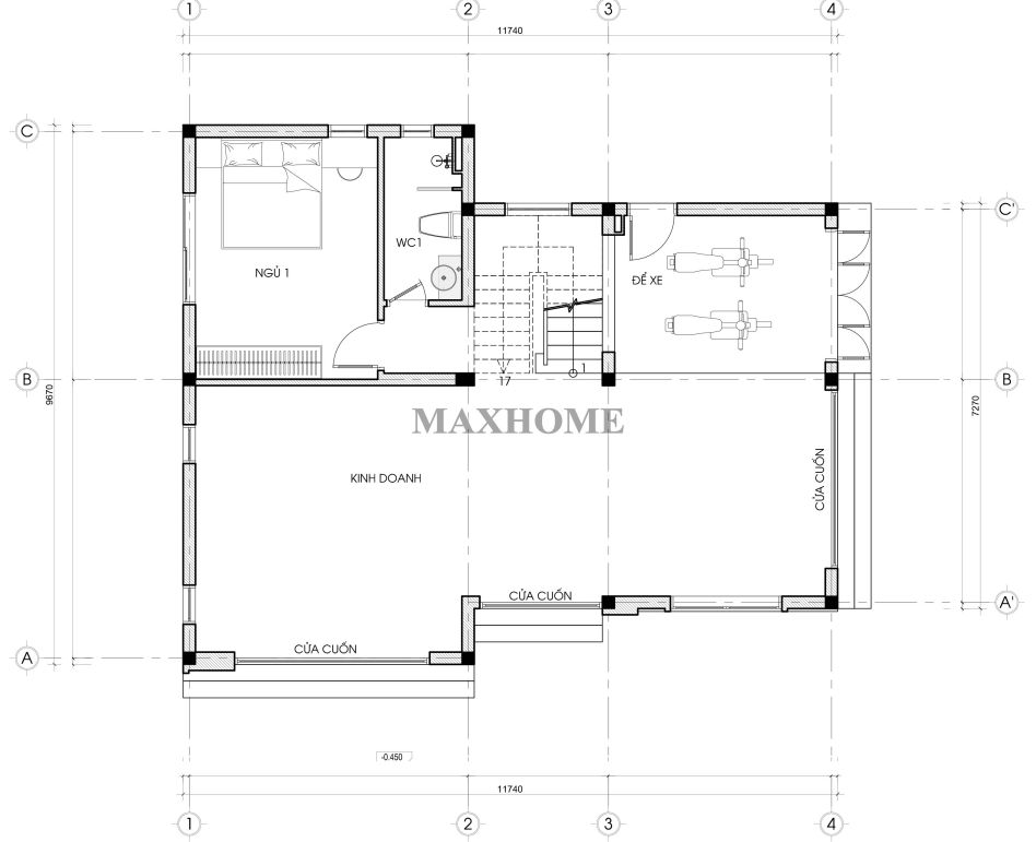 Tầng 1 được thiết kế làm không gian kinh doanh, đồng thời bố trí một khu vực để xe riêng biệt nhằm đảm bảo sự thuận tiện và an toàn cho việc di chuyển. Ngoài ra, tầng này còn có một phòng ngủ dành cho gia đình hoặc nhân viên trông coi, cùng với một nhà vệ sinh chung đặt cạnh bên, giúp việc sử dụng hằng ngày trở nên tiện lợi hơn.