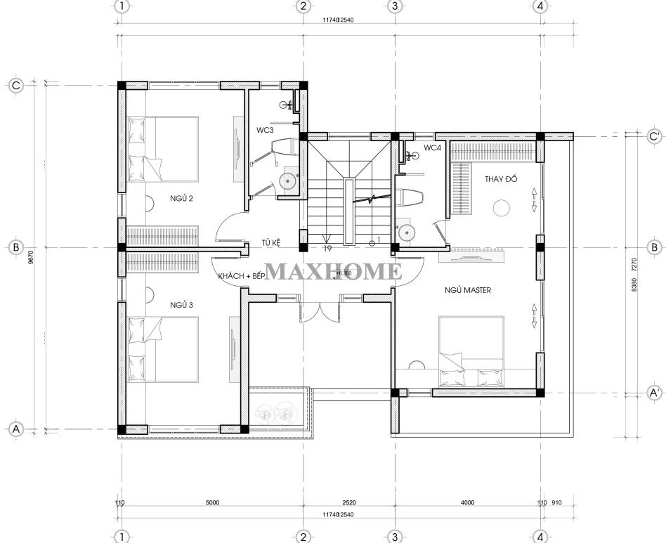 Tầng 2 được bố trí 3 phòng ngủ, trong đó phòng ngủ số 02 và số 03 sử dụng chung một nhà vệ sinh thuận tiện ngay bên ngoài. Riêng phòng ngủ master được thiết kế rộng rãi hơn, tích hợp phòng thay đồ riêng và nhà vệ sinh khép kín, mang lại sự riêng tư và thoải mái tối đa cho gia chủ. Cách bố trí này giúp tối ưu công năng sử dụng, đồng thời đáp ứng tốt nhu cầu sinh hoạt của các thành viên trong gia đình.