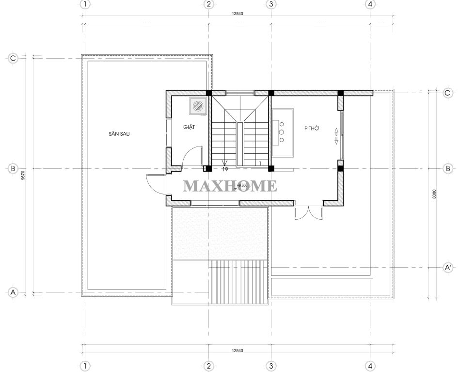 Tầng 3 được bố trí phòng thờ trang nghiêm, đảm bảo sự yên tĩnh và hợp phong thủy. Bên cạnh đó là khu vực giặt đồ thuận tiện cho sinh hoạt hằng ngày. Đặc biệt, tầng này sở hữu một khoảng sân cực kỳ rộng và thoáng, thích hợp làm nơi phơi phóng, trồng cây xanh hoặc bố trí không gian thư giãn ngoài trời cho các thành viên trong gia đình.