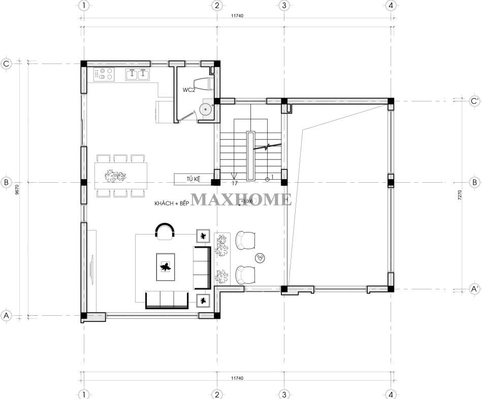 Tầng lửng được bố trí làm không gian sinh hoạt chung của gia đình, gồm phòng khách rộng thoáng và khu bếp – ăn liên thông. Cách bố trí này giúp tận dụng tối đa diện tích, tạo sự kết nối giữa các thành viên và mang lại cảm giác ấm cúng, tiện nghi cho ngôi nhà.