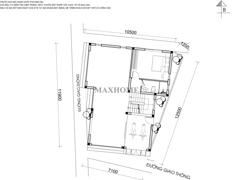 Mặt bằng định vị công trình cho thấy toàn bộ khuôn viên lô đất có kích thước 9,6 × 11,7m, đảm bảo không gian bố trí kiến trúc hợp lý. Tổng diện tích sàn sử dụng của ngôi nhà vào khoảng 350m², được phân bổ cho các tầng một cách khoa học, giúp tối ưu công năng và tạo sự thuận tiện trong quá trình sinh hoạt.