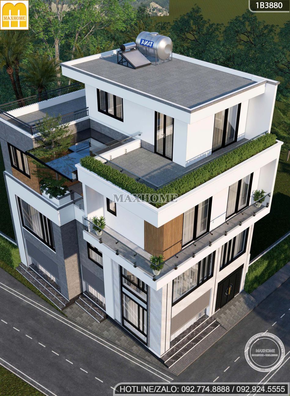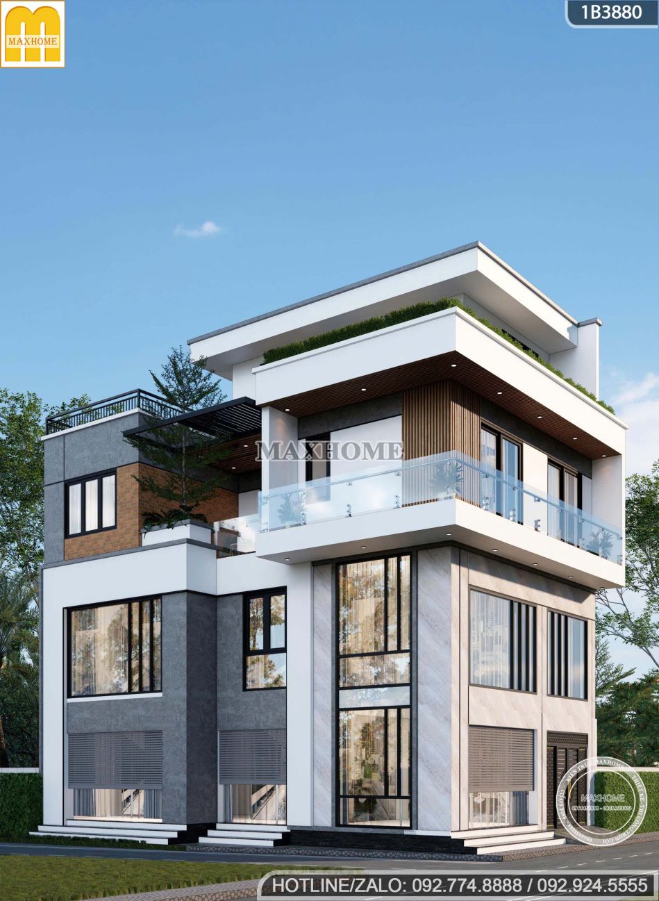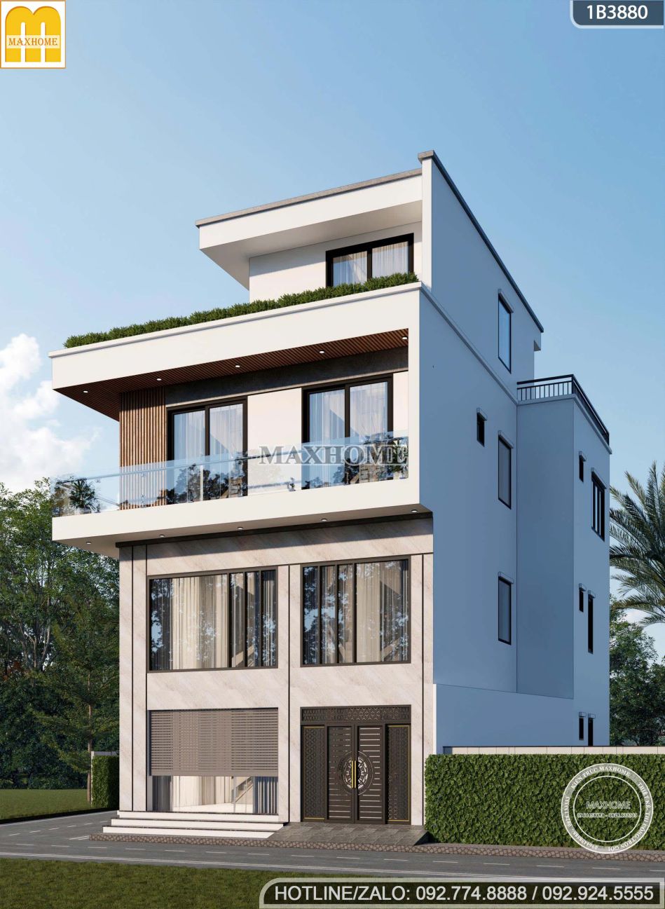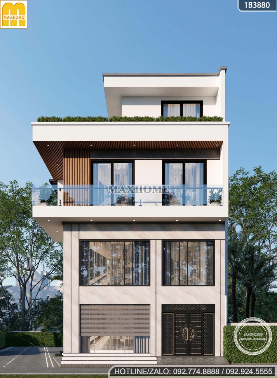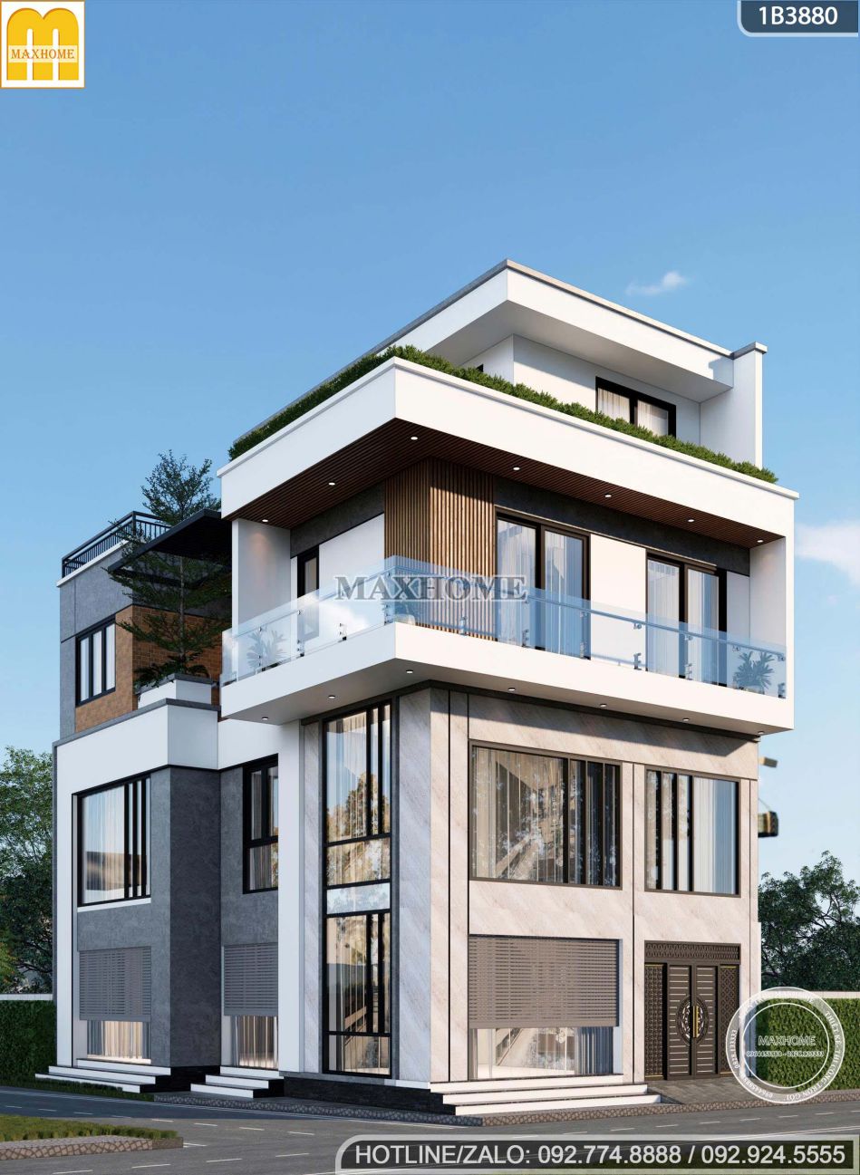 Mẫu nhà 3 tầng 1 lửng được thiết kế theo phong cách hiện đại, tọa lạc tại vị trí lô góc vô cùng đắc địa. Với mục đích sử dụng kết hợp kinh doanh, phần ngoại thất được đầu tư tỉ mỉ, chú trọng từng chi tiết để tạo nên vẻ đẹp sang trọng và thu hút. Thiết kế này không chỉ tăng tính thẩm mỹ mà còn góp phần nâng cao giá trị thương mại, giúp công trình dễ dàng ghi điểm trong mắt khách hàng và đối tác.