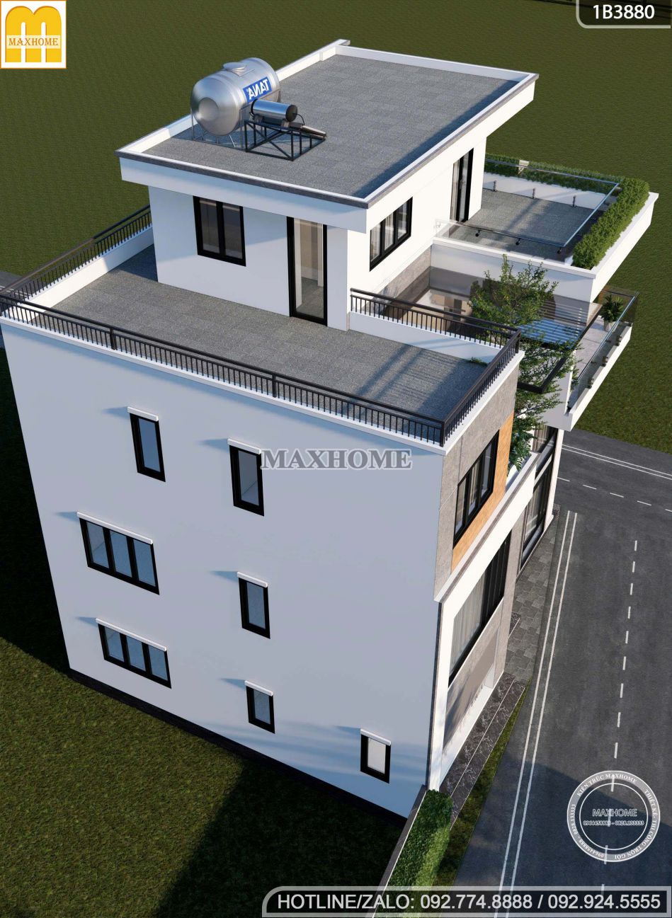 Tầng 3 và sân thượng mở tạo nên khoảng không gian rộng rãi cho gia chủ sử dụng làm khu thư giãn, trồng cây xanh hoặc tổ chức sinh hoạt ngoài trời. Hệ thống cây xanh bố trí trên các tầng tạo cảm giác hài hòa với thiên nhiên, mang đến sự thoáng mát và nâng cao giá trị thẩm mỹ cho công trình. Tổng thể thiết kế toát lên vẻ đẹp hiện đại, sang trọng và vô cùng phù hợp cho mô hình nhà ở kết hợp kinh doanh tại đô thị.