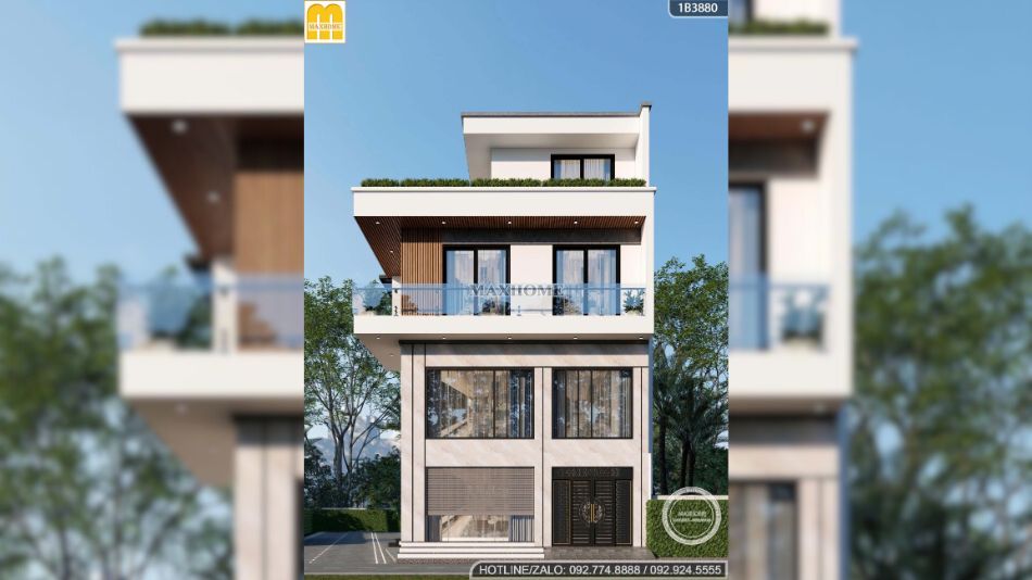 Điểm nhấn của công trình còn thể hiện rõ qua hệ lan can kính hiện đại, các mảng tường ốp gỗ nhựa trang trí và khu vực sân thượng rộng rãi được kết hợp hài hòa với mảng xanh. Những chi tiết này tạo nên vẻ đẹp sang trọng, đồng thời mang đến sự cân bằng giữa kiến trúc và thiên nhiên. Đây là lựa chọn lý tưởng cho những gia đình yêu thích phong cách hiện đại, thông thoáng, phù hợp cho cả nhu cầu ở và kết hợp kinh doanh.