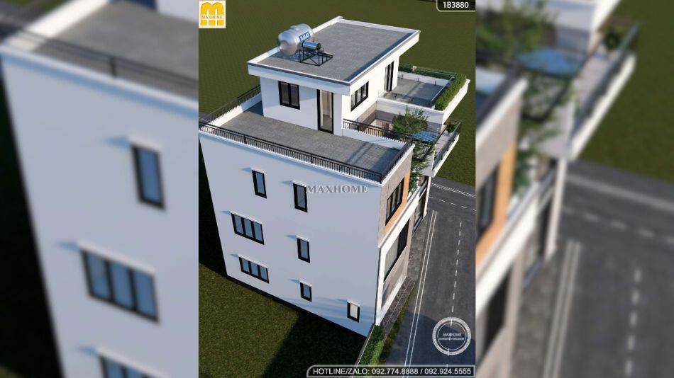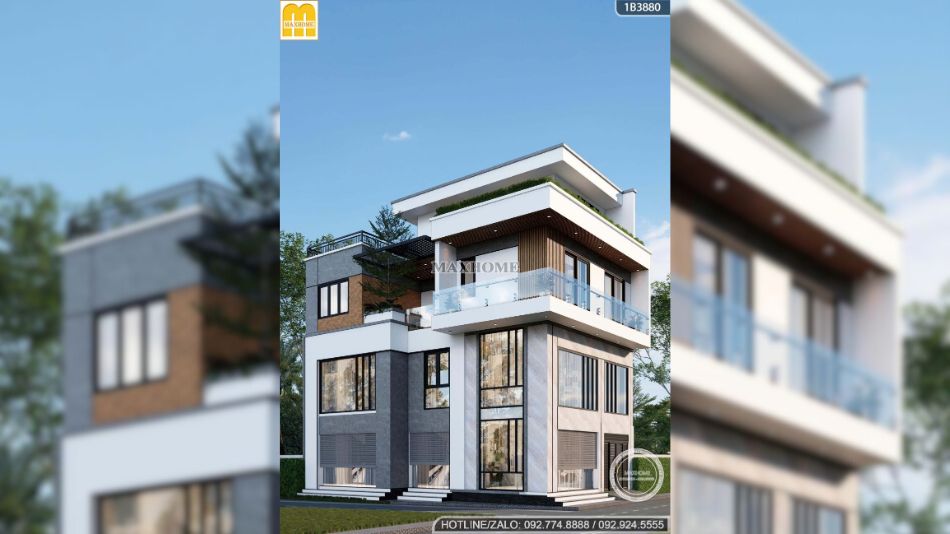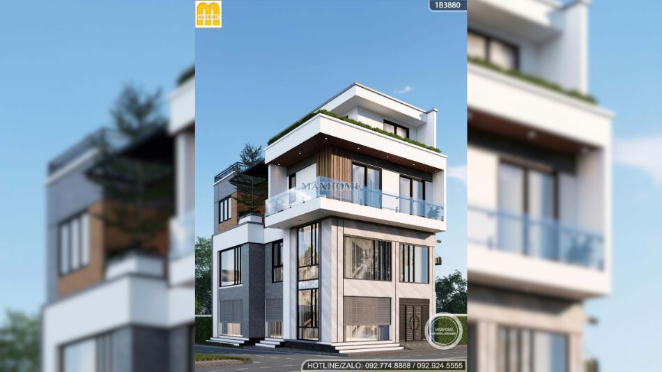 Mẫu nhà 3 tầng 1 lửng được thiết kế theo phong cách hiện đại, tọa lạc tại vị trí lô góc vô cùng đắc địa. Với mục đích sử dụng kết hợp kinh doanh, phần ngoại thất được đầu tư tỉ mỉ, chú trọng từng chi tiết để tạo nên vẻ đẹp sang trọng và thu hút. Thiết kế này không chỉ tăng tính thẩm mỹ mà còn góp phần nâng cao giá trị thương mại, giúp công trình dễ dàng ghi điểm trong mắt khách hàng và đối tác.