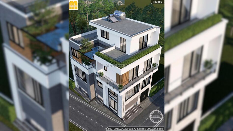 Tầng 3 và sân thượng mở tạo nên khoảng không gian rộng rãi cho gia chủ sử dụng làm khu thư giãn, trồng cây xanh hoặc tổ chức sinh hoạt ngoài trời. Hệ thống cây xanh bố trí trên các tầng tạo cảm giác hài hòa với thiên nhiên, mang đến sự thoáng mát và nâng cao giá trị thẩm mỹ cho công trình. Tổng thể thiết kế toát lên vẻ đẹp hiện đại, sang trọng và vô cùng phù hợp cho mô hình nhà ở kết hợp kinh doanh tại đô thị.