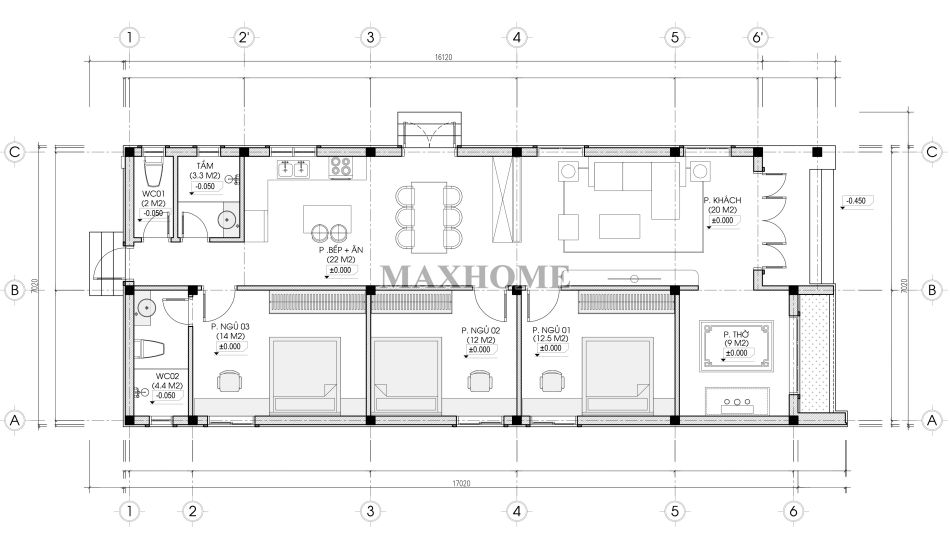 Phía sau là không gian bếp và phòng ăn được thiết kế thông thoáng, kết nối trực tiếp với sảnh phụ, giúp việc di chuyển và sinh hoạt trở nên thuận tiện hơn. Ba phòng ngủ được bố trí liền kề về phía bên phải ngôi nhà, đảm bảo sự riêng tư và yên tĩnh, trong đó phòng ngủ số 03 được thiết kế khép kín với WC riêng. Ngoài ra, còn có một phòng tắm và một WC chung đặt cuối nhà, được sắp xếp hợp lý nhằm đảm bảo công năng sử dụng, sự tiện nghi và tính thẩm mỹ cho toàn bộ không gian sống.