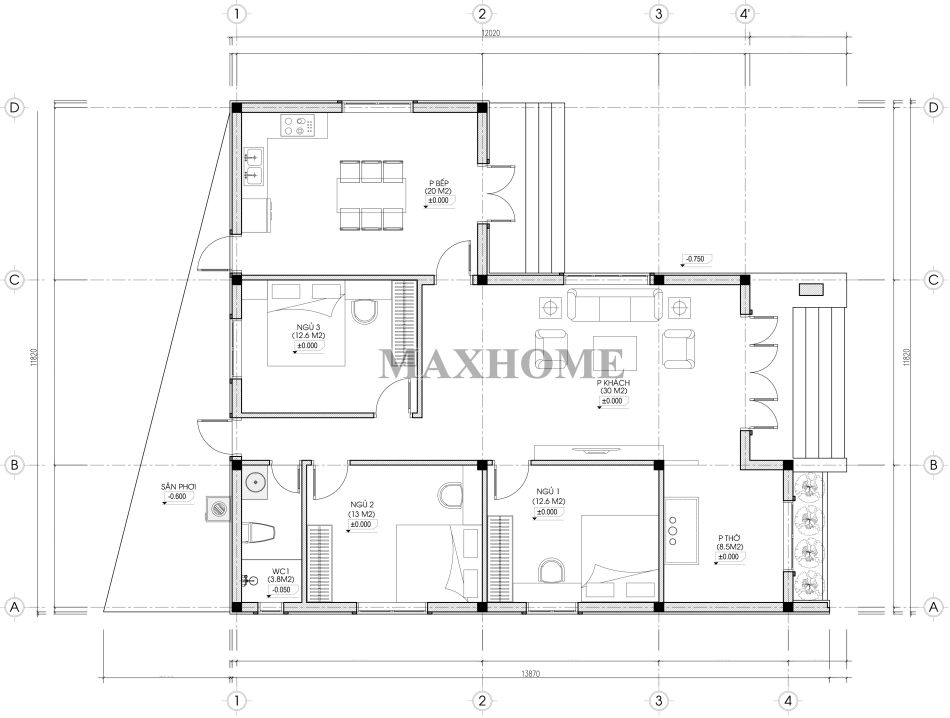 Bên cạnh vẻ đẹp kiến trúc tinh tế, sang trọng thì ngôi nhà cấp 4 chữ L mái bằng còn ghi điểm nhờ cách bố trí công năng hợp lý. Ba phòng ngủ được sắp đặt khoa học, vừa giữ thẩm mỹ vừa đáp ứng yếu tố phong thủy, mang đến cảm giác thoải mái cho mọi thành viên. Công trình nằm ở hướng Đông Bắc, kích thước xây dựng 11,8 x 13,8m với tổng diện tích sử dụng 115m², tạo nên một không gian sống gọn gàng, tiện nghi và dễ chịu.