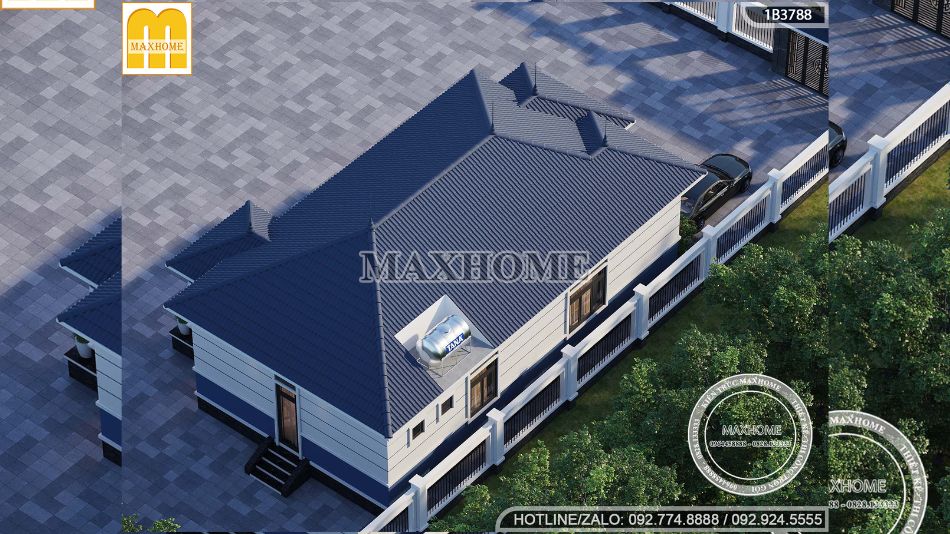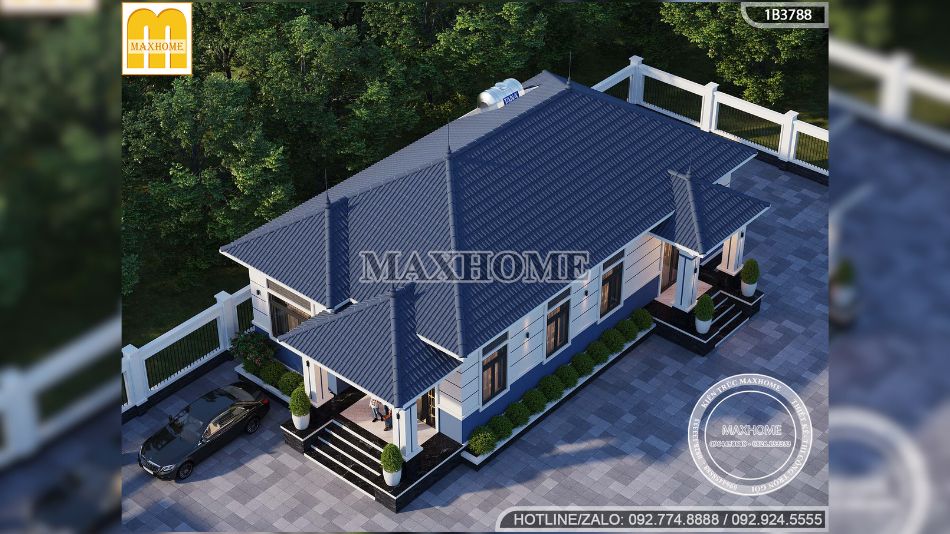 Tổng thể kiến trúc gây ấn tượng với hệ mái Nhật đăng đối, tạo nên vẻ đẹp tinh tế và trang nhã. Mái có độ dốc vừa phải, các tầng mái được xếp lớp nhẹ nhàng, không chỉ giúp công trình toát lên sự thanh thoát mà còn tối ưu khả năng thoát nước, che nắng, chống ẩm mốc hiệu quả, phù hợp với khí hậu Việt Nam. Màu mái xanh than được lựa chọn khéo léo, vừa sang trọng, vừa tạo chiều sâu thị giác, giúp công trình nổi bật giữa không gian xanh mướt.