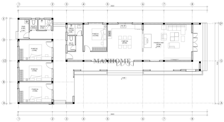 Từ sảnh chính bước vào là không gian phòng khách kết hợp phòng thờ trang nghiêm và rộng rãi. Tiến vào phía trong là khu vực bếp ăn được bố trí khoa học, thuận tiện cho sinh hoạt hằng ngày. Kế tiếp là một phòng ngủ và cuối dãy là phòng tắm cùng nhà vệ sinh chung phục vụ toàn bộ khu vực. Ở nhánh còn lại của chữ L là hành lang dẫn vào 3 phòng ngủ được sắp xếp liền kề nhau, đảm bảo sự riêng tư nhưng vẫn thuận tiện di chuyển. Cuối nhà là khu vực phòng tắm, một phòng vệ sinh và sân phơi rộng khoảng 4m², phục vụ tốt cho nhu cầu giặt giũ và phơi đồ của gia đình.