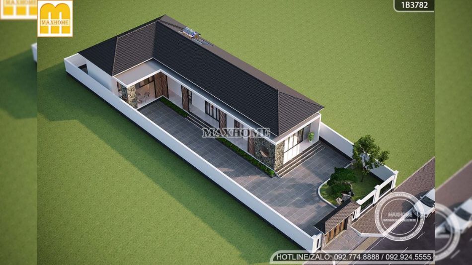 Khoảng trống tại vị trí chữ L được thiết kế rộng rãi, tạo nên không gian sân chơi thoáng đãng và thuận tiện cho các hoạt động ngoài trời của gia đình. Khu vực này còn có thể tận dụng để bố trí tiểu cảnh, trồng cây xanh hoặc đặt bộ bàn ghế nghỉ ngơi, mang đến sự thư giãn và tăng tính kết nối với thiên nhiên. Nhờ đó, tổng thể ngôi nhà trở nên hài hòa, sinh động và đầy sức sống hơn.