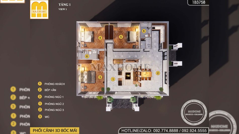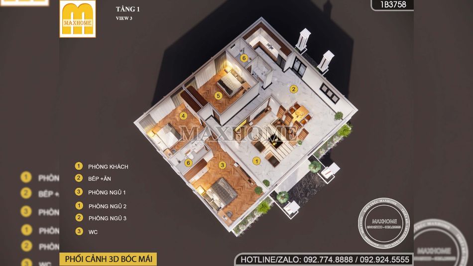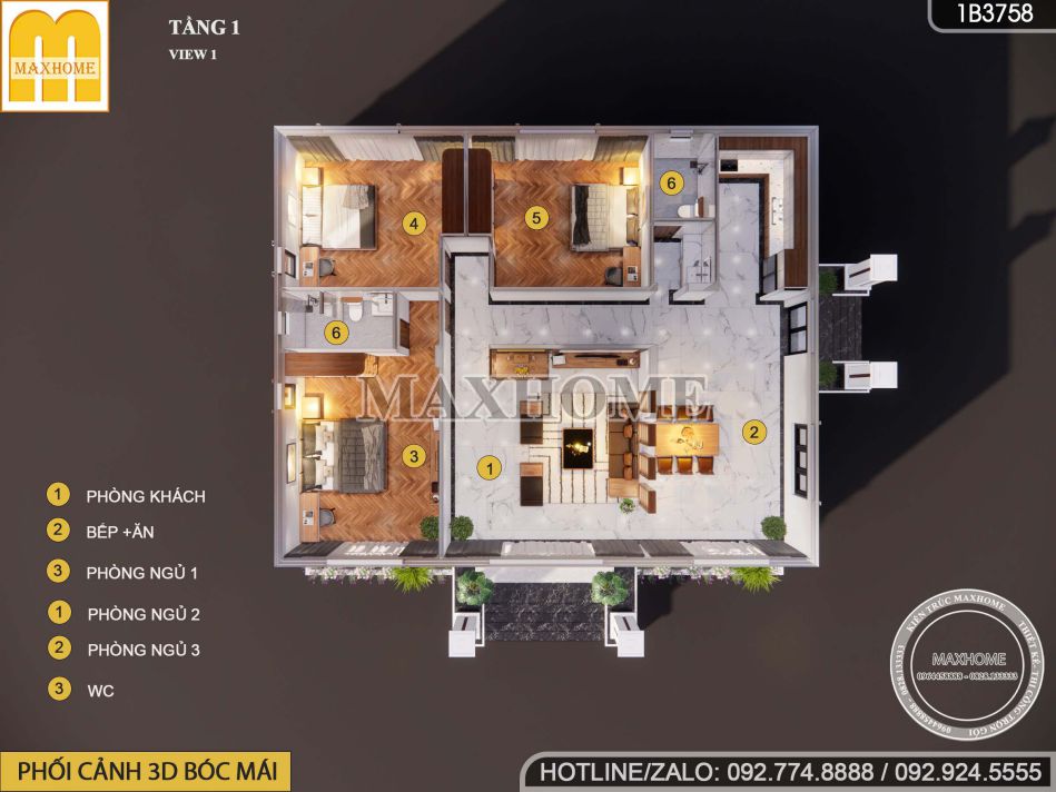 Phòng khách, phòng bếp ăn, 3 phòng ngủ, 2 wc