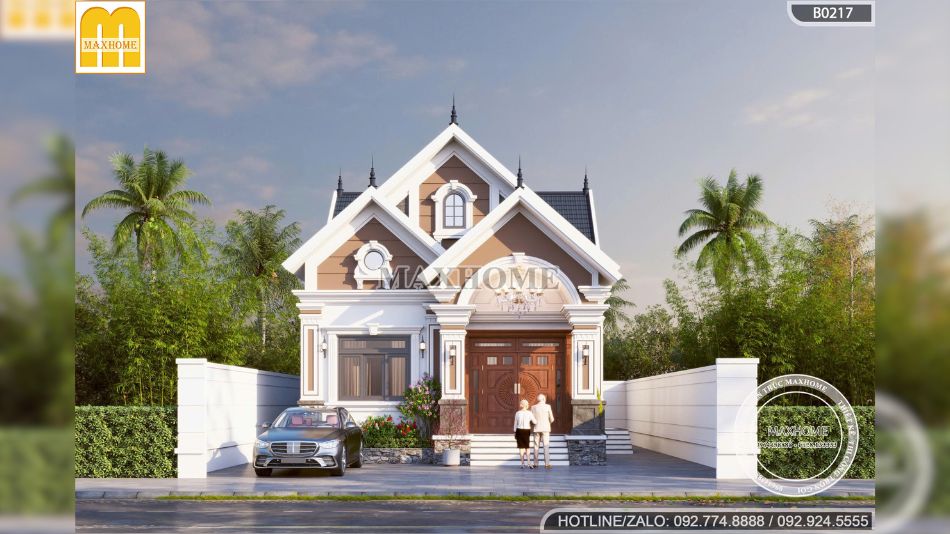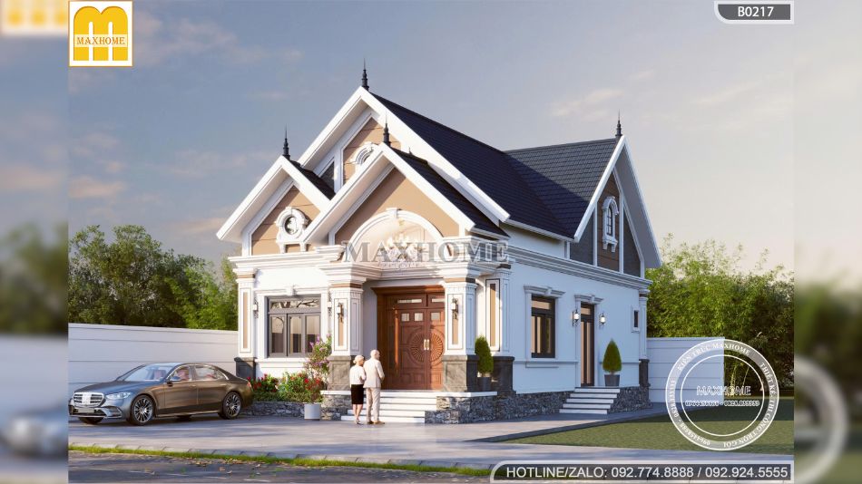 Bảng màu ngoại thất được phối hợp tinh tế giữa các gam trung tính như trắng, ghi và nâu nhạt, tạo nên tổng thể hài hòa, thanh lịch. Sự chuyển sắc nhẹ nhàng giữa các mảng tường, phào chỉ và chân đế ốp đá giúp công trình vừa nổi bật, vừa giữ được vẻ sang trọng lâu dài. Đặc biệt, vật liệu trang trí được lựa chọn kỹ lưỡng không chỉ đảm bảo tính thẩm mỹ mà còn giúp bảo vệ bề mặt công trình trước tác động của thời tiết, giảm chi phí bảo trì trong quá trình sử dụng.