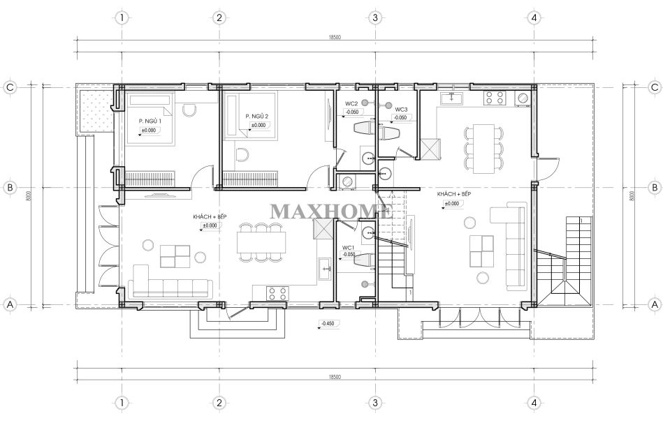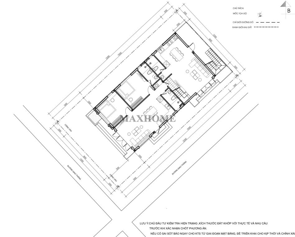 Mặt bằng định vị công trình giúp xác định rõ vị trí ngôi nhà trong tổng thể khuôn viên đất, đảm bảo việc bố trí các hạng mục được hợp lý và khoa học. Ngôi nhà có mặt tiền rộng 8m, chiều sâu 18,5m, tạo nên hình khối cân đối và đẹp mắt. Với tổng diện tích sử dụng khoảng 270m², công trình mang đến không gian sống rộng rãi, đáp ứng đầy đủ nhu cầu sinh hoạt của gia đình nhiều thế hệ, đồng thời vẫn đảm bảo tính thẩm mỹ và tối ưu công năng sử dụng trên từng mét vuông diện tích.