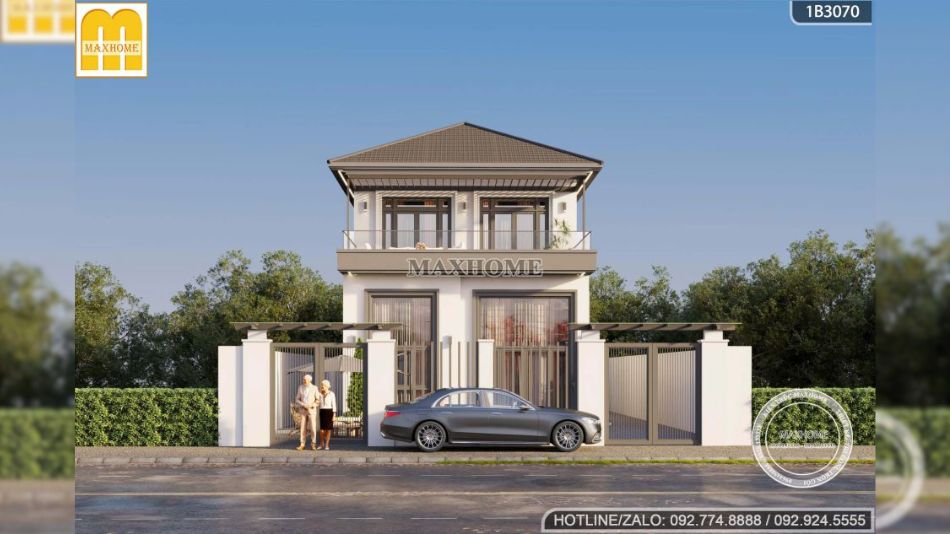 Mẫu nhà mái Nhật 2 tầng 1 lửng được thiết kế với hệ thống cổng hiện đại, gồm hai cánh cổng riêng biệt tạo sự thuận tiện trong việc di chuyển và phân luồng lối đi. Toàn bộ cổng được chế tác từ sắt sơn tĩnh điện cao cấp, đảm bảo độ bền, khả năng chống gỉ sét và giữ màu sắc bền đẹp theo thời gian. Thiết kế cổng không chỉ mang lại tính an toàn, chắc chắn mà còn góp phần tôn lên vẻ sang trọng, đồng bộ với tổng thể kiến trúc của ngôi nhà.