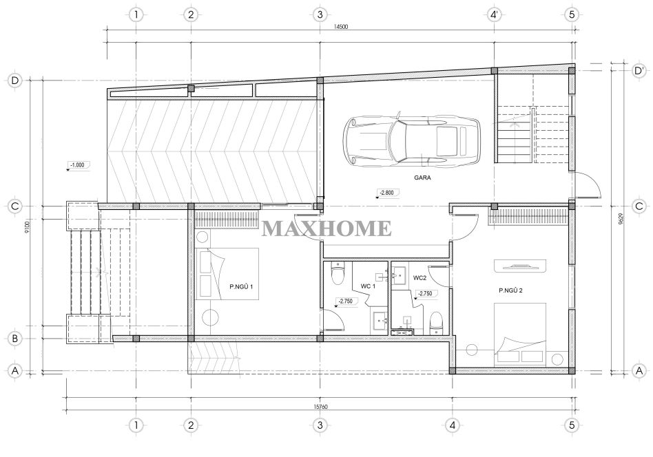 Khu vực tầng hầm được tận dụng làm gara ô tô rộng rãi, thuận tiện cho việc di chuyển và đỗ xe an toàn. Trên tầng chính, cả hai phòng ngủ đều được thiết kế khép kín với nhà vệ sinh riêng bên trong, mang đến sự riêng tư và tiện nghi tối đa cho từng thành viên trong gia đình. Cách bố trí này không chỉ tối ưu công năng sử dụng mà còn góp phần nâng cao chất lượng không gian sống.