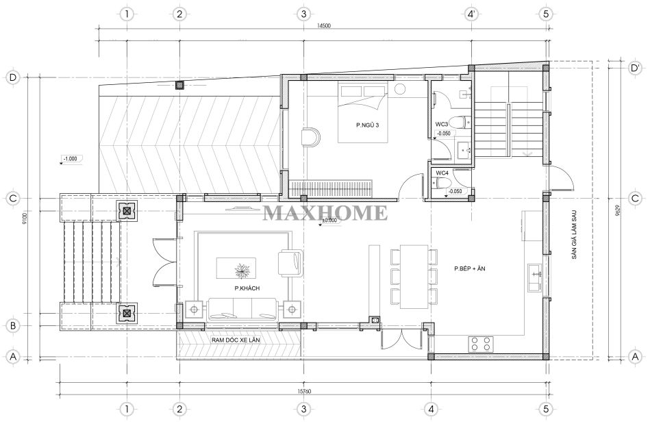 Tầng 1 của ngôi nhà được bố trí khoa học, bắt đầu với phòng khách rộng rãi ở phía trước, là nơi sinh hoạt và đón tiếp khách. Tiếp nối là không gian bếp ăn thoáng đãng, có cửa phụ mở ra bên hông, giúp lưu thông không khí và thuận tiện cho việc di chuyển. Trên tầng này còn có một phòng ngủ khép kín với nhà vệ sinh riêng, mang lại sự riêng tư và tiện lợi cho người sử dụng. Ngoài ra, một nhà vệ sinh chung được bố trí cuối nhà, ngay cạnh cầu thang, đảm bảo sự thuận tiện cho sinh hoạt hằng ngày. Đây là phương án sắp xếp hợp lý, đặc biệt phù hợp với những công trình có thiết kế tầng hầm, giúp tối ưu diện tích và công năng sử dụng.