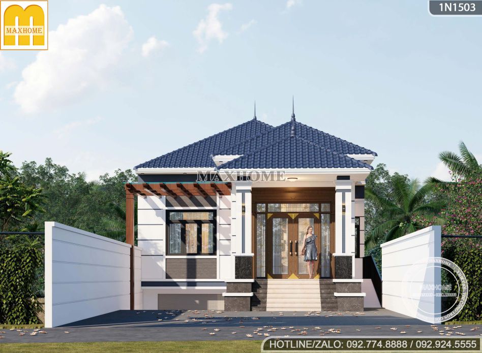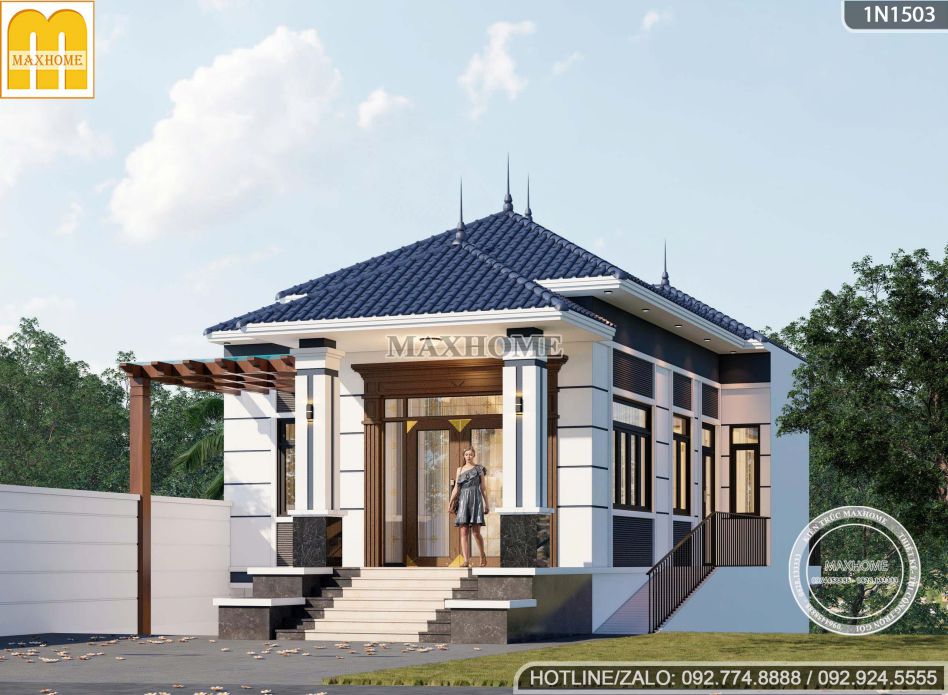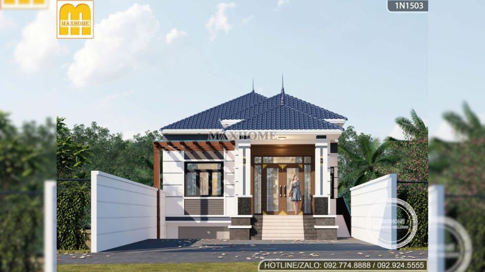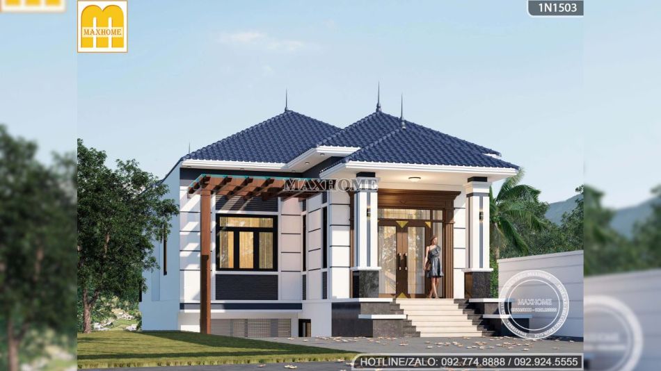 Mẫu nhà mái Nhật có tầng hầm này được khoác lên gam màu trắng làm chủ đạo, mang đến cảm giác tinh khôi và sang trọng. Điểm nhấn nổi bật đến từ những đường kẻ màu xanh được bố trí khéo léo quanh mảng tường và hệ cột chính, tạo nên sự hài hòa và sinh động cho tổng thể kiến trúc. Bên cạnh đó, phần viền cửa sổ được ốp gạch thẻ trang trí, không chỉ tăng tính thẩm mỹ mà còn giúp công trình thêm phần chắc chắn và bền đẹp theo thời gian.