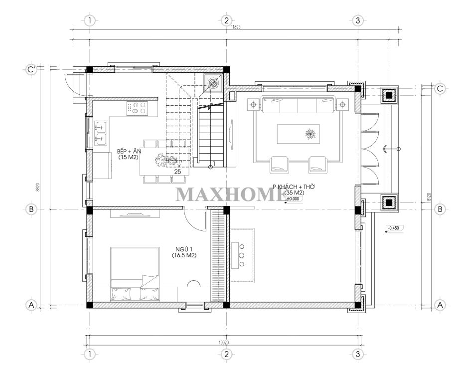 Bước qua sảnh chính, bạn sẽ bắt gặp không gian phòng khách sang trọng – nơi thể hiện rõ nét gu thẩm mỹ tinh tế và lòng hiếu khách của gia chủ. Liền kề bên trái là phòng thờ được bố trí trang nghiêm, sử dụng vách ngăn CNC hiện đại vừa đảm bảo sự yên tĩnh, tôn nghiêm. Tiếp nối phía sau là căn bếp tiện nghi, ấm cúng, cùng một phòng ngủ riêng tư mang lại sự thoải mái tối đa cho thành viên trong gia đình.