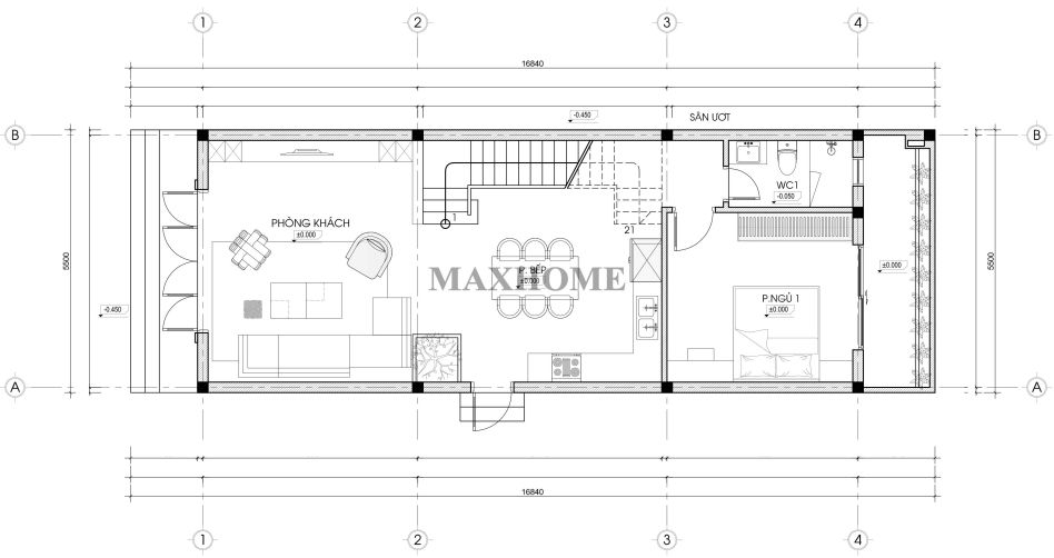 Hình ảnh mặt bằng định vị cho thấy tổng thể khuôn viên đất có kích thước 5,5 x 16,8m, được quy hoạch khoa học và hợp lý. Với tổng diện tích sử dụng khoảng 184m², ngôi nhà được bố trí tối ưu từng không gian chức năng, đảm bảo sự tiện nghi và đáp ứng đầy đủ nhu cầu sinh hoạt của các thành viên trong gia đình. Cách sắp xếp mặt bằng cũng thể hiện sự tính toán kỹ lưỡng của đội ngũ kiến trúc sư Maxhome nhằm tận dụng tối đa diện tích và mang lại hiệu quả thẩm mỹ cao.