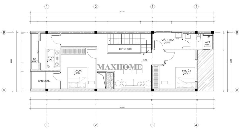 Tầng 2 được bố trí hợp lý với các không gian chức năng tiện nghi và thoáng sáng. Phòng thờ có diện tích vừa phải nhưng vẫn giữ được sự trang nghiêm và yên tĩnh, thể hiện lòng thành kính của gia chủ đối với tổ tiên. Kế bên là phòng sinh hoạt chung ngập tràn ánh sáng tự nhiên nhờ hệ giếng trời thông thoáng, là nơi lý tưởng để các thành viên sum họp và thư giãn. 2 phòng ngủ được thiết kế đảm bảo sự riêng tư, cùng khu vực giặt phơi rộng rãi và một nhà vệ sinh chung được bố trí thuận tiện cho sinh hoạt hằng ngày.