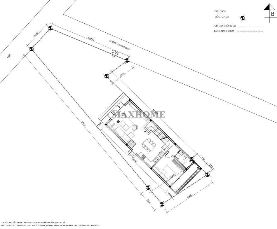 Công trình nhà ống 2 tầng được xây dựng trên khuôn viên đất không vuông vắn, tuy nhiên nhờ sự tính toán khéo léo của đội ngũ kiến trúc sư Maxhome, ngôi nhà vẫn đảm bảo bố cục hài hòa và công năng tối ưu. Phần mặt bằng được xử lý linh hoạt, tận dụng tối đa diện tích sử dụng, đồng thời tạo ra những khoảng không gian mở giúp ngôi nhà luôn thông thoáng và tràn ngập ánh sáng tự nhiên. Hệ thống cổng, tường rào và lối đi lát đá đồng bộ với tổng thể kiến trúc, mang lại vẻ đẹp hiện đại, tinh tế và sang trọng cho toàn bộ công trình.