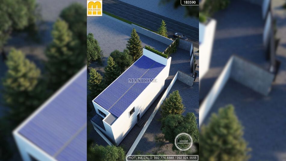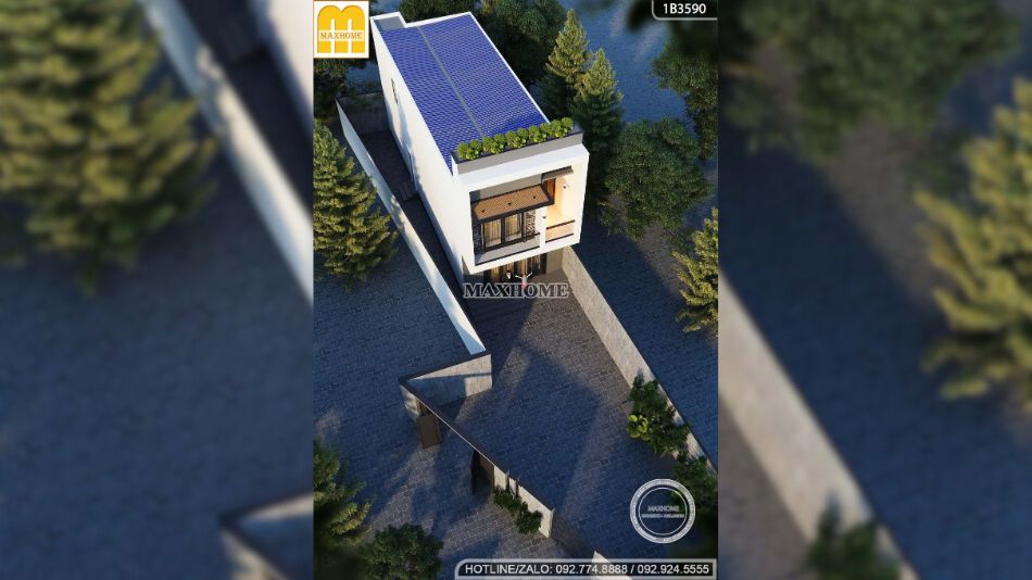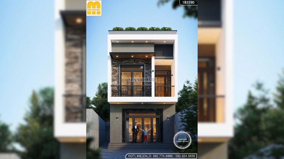 Công trình nhà ống 2 tầng được xây dựng trên khuôn viên đất không vuông vắn, tuy nhiên nhờ sự tính toán khéo léo của đội ngũ kiến trúc sư Maxhome, ngôi nhà vẫn đảm bảo bố cục hài hòa và công năng tối ưu. Phần mặt bằng được xử lý linh hoạt, tận dụng tối đa diện tích sử dụng, đồng thời tạo ra những khoảng không gian mở giúp ngôi nhà luôn thông thoáng và tràn ngập ánh sáng tự nhiên. Hệ thống cổng, tường rào và lối đi lát đá đồng bộ với tổng thể kiến trúc, mang lại vẻ đẹp hiện đại, tinh tế và sang trọng cho toàn bộ công trình.