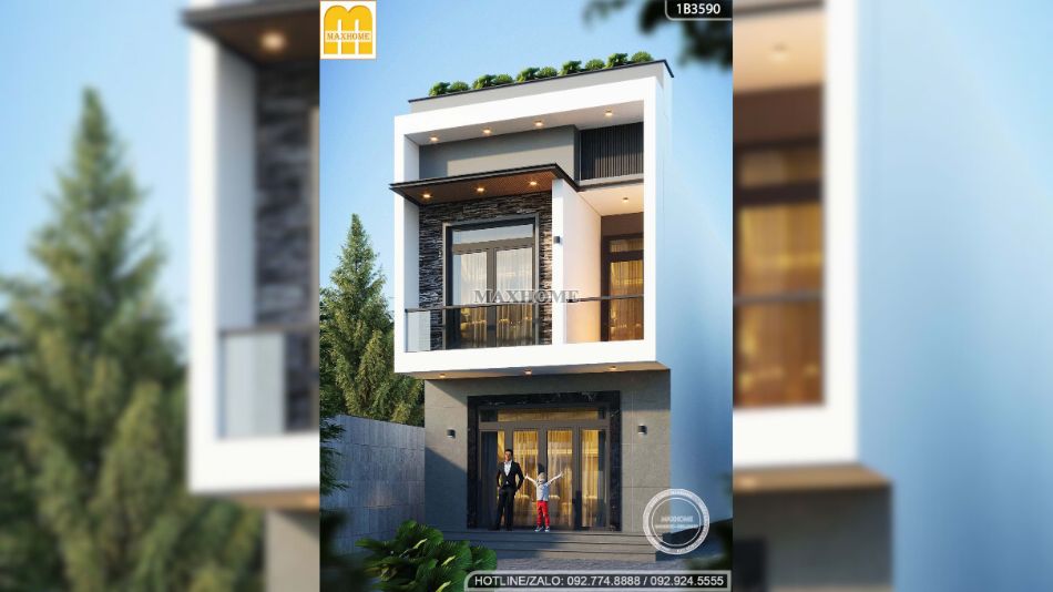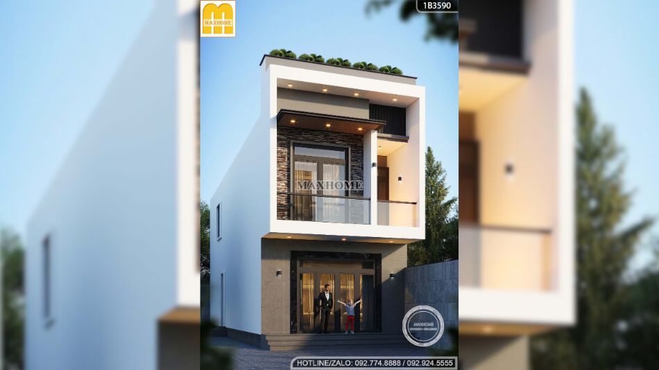 Ngôi nhà ống 2 tầng được khoác lên mình gam màu trắng tinh tế, tạo cảm giác tươi sáng và hiện đại. Toàn bộ mặt tiền tầng 1 được ốp gạch trang trí cao cấp, trong khi tầng 2 sử dụng đá ốp và chi tiết gỗ giả trần kết hợp cùng hệ thống đèn LED âm trần, mang đến vẻ đẹp sang trọng và cuốn hút khi đêm xuống. Thiết kế ban công và sân thượng rộng rãi không chỉ giúp ngôi nhà trở nên thoáng mát mà còn là không gian lý tưởng để các thành viên thư giãn, tận hưởng không khí trong lành sau những giờ làm việc căng thẳng.